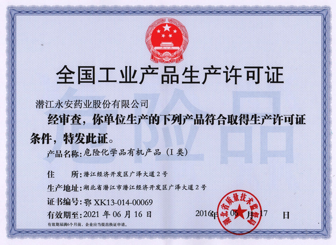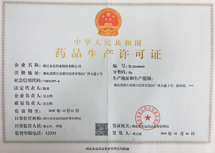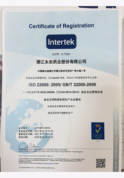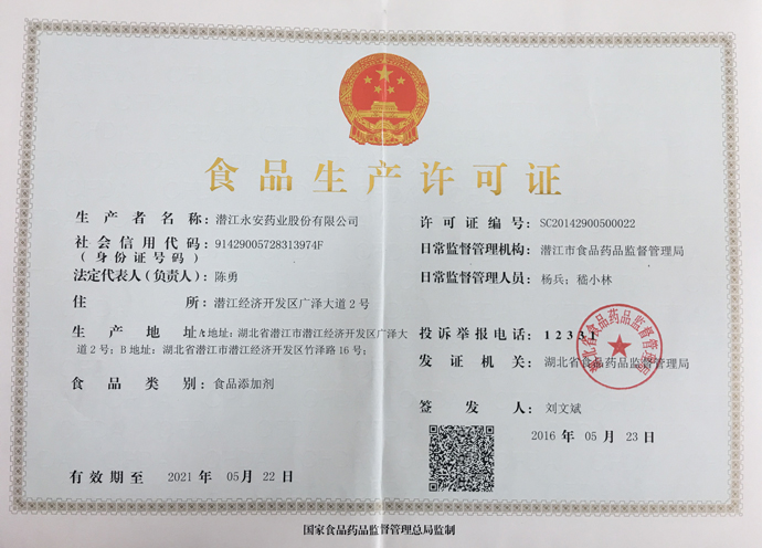 潛江永安藥業股份有限公司成立于2001年,坐落于江漢平原腹地潛江市國家高新技術產業開發(fā)區,占地500余畝,注冊資金貳億玖仟肆佰陸拾捌萬貳仟伍佰元整,是一家擁有自主知識產權的國家高新技術企業。公司股票于2010年3 月5日在深圳證券交易所掛牌上市(股票代碼為002365)。公司具有雄厚的技術開發(fā)能力,是湖北省創(chuàng)新型企業和湖北省知識產權建設示范企業。公司研發(fā)平臺分別被認定為省級企業技術中心和湖北省功能性食品添加劑工程技術研究中心。 經過多年的發(fā)展,公司形成了以食品及藥品添加劑?;?/p>